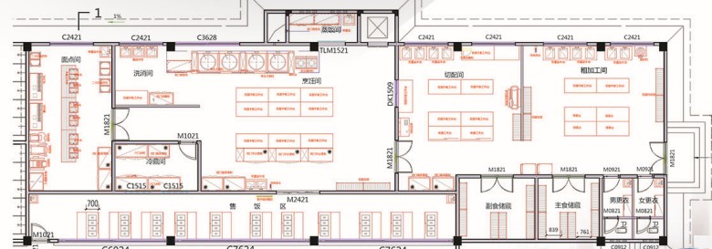 根據(jù)工作實際需要選用設備,按照工藝流程順序布局設備,確保工作流程順暢。設計中需要考慮人員運動、操作動作、物流順序,按照工作流程流水線運作,減少無效勞動,使物流生熟分開、潔污分離。例如,粗加工間一進門就應設有菜架、冰柜,原料進入工作間,要有存放位置;其次就要有撿摘、清洗的工作臺、洗菜池、垃圾車,以及凈菜存放位的貨架、運送的車輛。