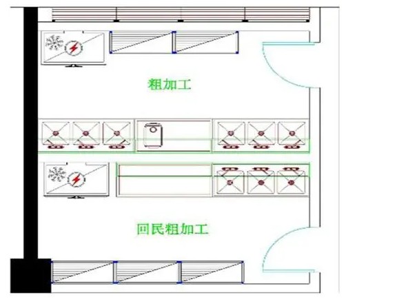 粗加工區(qū):為滿足衛(wèi)生要求,對原料分別進行清洗和切割,不得與廚房其他區(qū)域交叉。