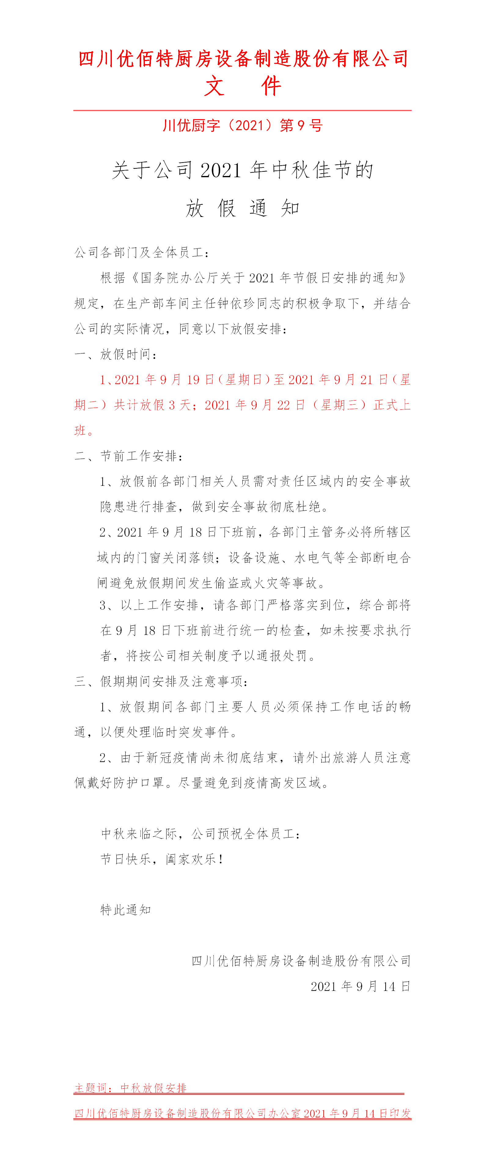 中秋佳節(jié)將至,為了迎接這個(gè)傳統(tǒng)節(jié)日,我公司根據(jù)國(guó)務(wù)院放假要求,并結(jié)合自身實(shí)際情況做出如下放假安排: