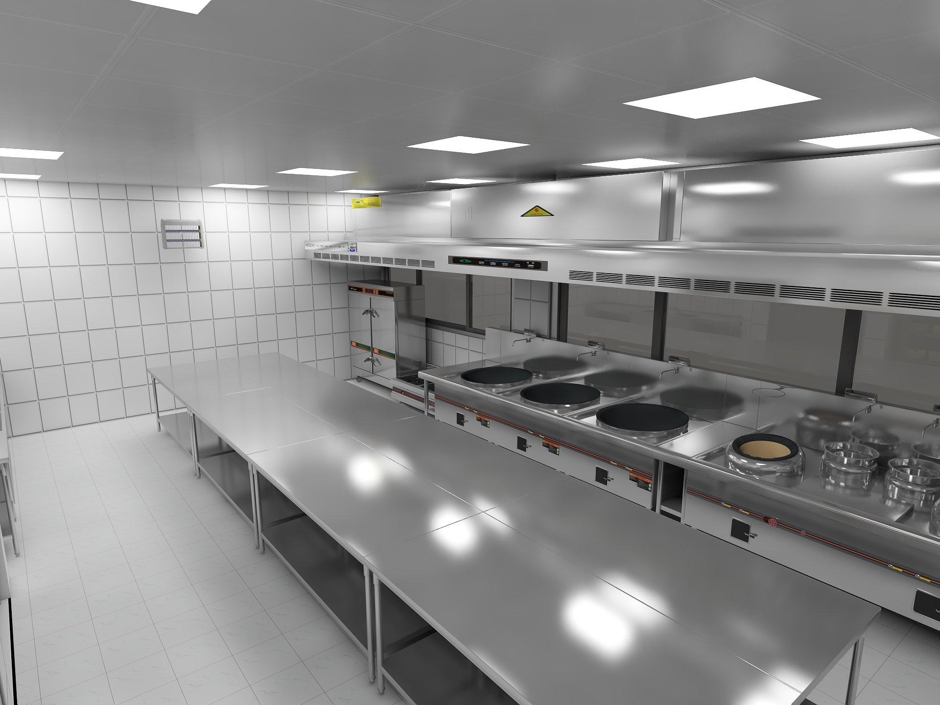 餐廳的燈光重文化,廚房的燈光重實用。這里的實用,主要指臨爐炒菜要有足夠的燈光以把握菜肴色澤;案板切配要有明亮的燈光,以有效防止刀傷和追求精細的刀工;出菜打荷的上方要有充足的燈光,切實減少雜草混入并流入餐廳等等。廚房燈光不一定要像餐廳一樣豪華典雅、布局整齊,但其作用絕不可忽視。