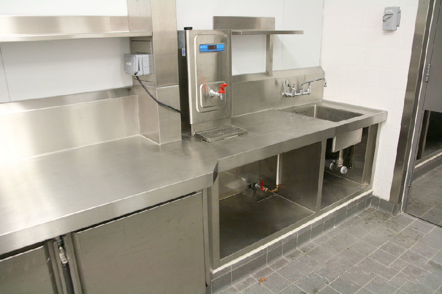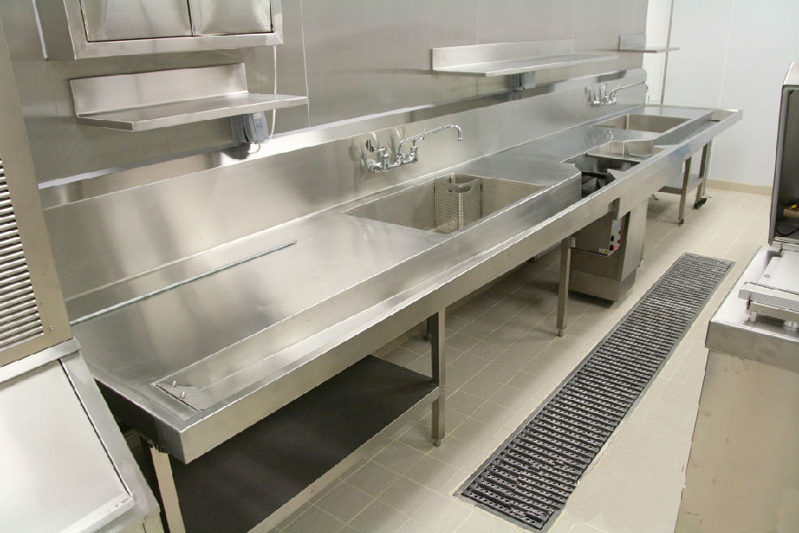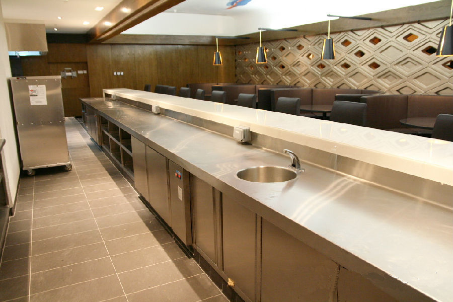 依然是一流的現(xiàn)場(chǎng)無縫焊接工藝,臺(tái)面非常平整,對(duì)土建(地臺(tái)施工),現(xiàn)場(chǎng)焊接工藝,調(diào)理臺(tái)的制造工藝要求非常高。工作臺(tái)的背板用大弧度L型設(shè)計(jì),避免藏污納垢,容易清洗。