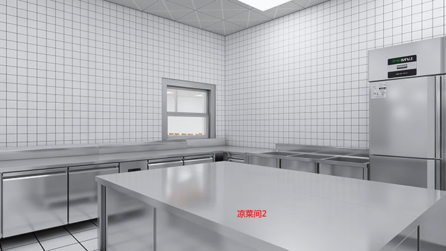 該工作區(qū)域負責涼菜熟制、改刀裝盤、水果盤的切制裝配及出品等工作。為保證成品質(zhì)量、防止涼菜切配受污染變質(zhì),應(yīng)保持室內(nèi)高度潔凈和低溫環(huán)境。檔次較高的飯店,涼菜間設(shè)洗手更衣的預(yù)進間和出餐口。為保證涼菜間的低溫潔凈,涼菜的熟制應(yīng)該在另設(shè)的加工間內(nèi)進行。涼菜熟制需要炒灶、湯灶等爐具;涼菜改刀裝盤還需要配置工作臺、保鮮工作臺、拉門工作臺、冰柜、貨架、貨柜、碗柜、水果保鮮柜、制冰機、碎冰機等。