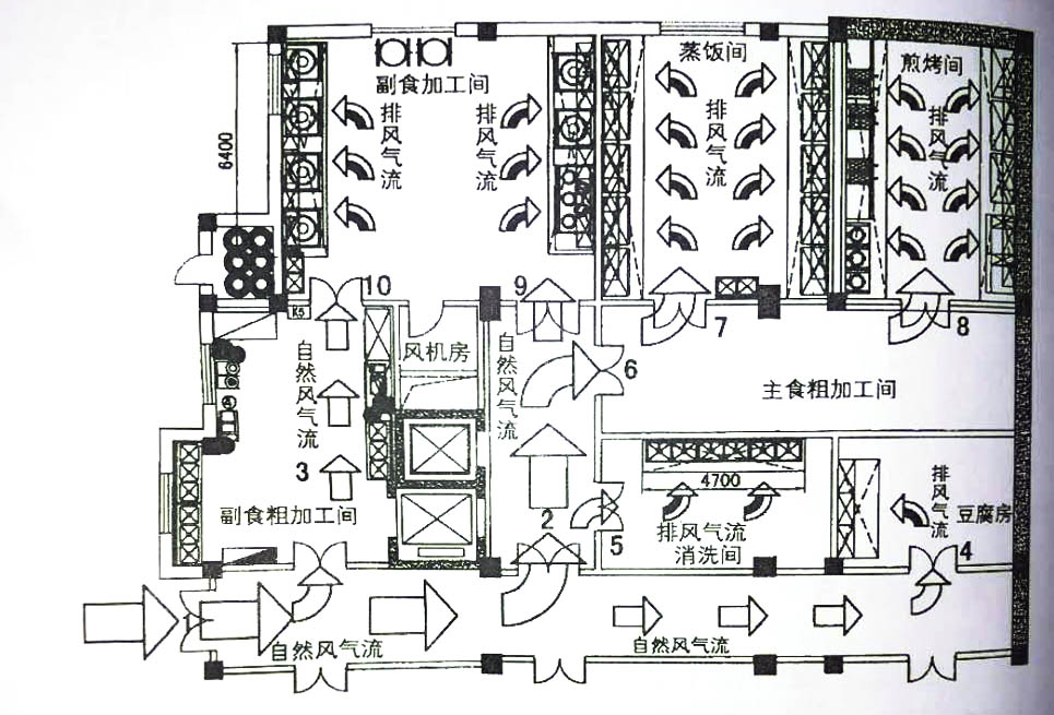 首先,圖一是一個學校食堂的半地下廚房,售飯區(qū)和明檔在二、三層,傳菜收殘全部用傳菜梯,廚房有一個出入口1號門。由于不補充新風,負壓太大,主食加工的蒸飯間和前烤間出入口7號、8號門關門后就很難打開,此時,下水道的污氣、污水回流。